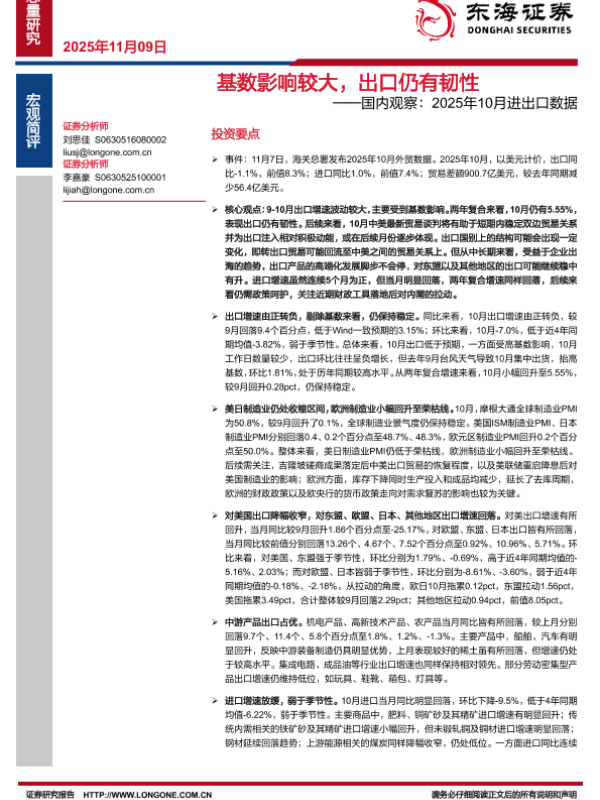 【东海证券】【202511】基数影响较大,出口仍有韧性——国内观察:2025年10月进出口数据-7页 证券期货研究报告