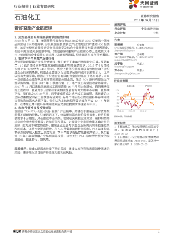 【天风证券】【20190616】20190616-天风证券-石油化工行业专题研究:看好聚酯产业链反弹-7页 行业研究