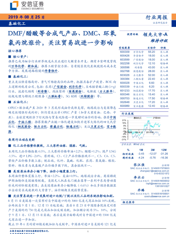 【安信证券】【20190825】基础化工行业周报:DMF 醋酸等合成气产品、DMC、环氧氯丙烷涨价,关注贸易战进一步影响-8页 行业研究