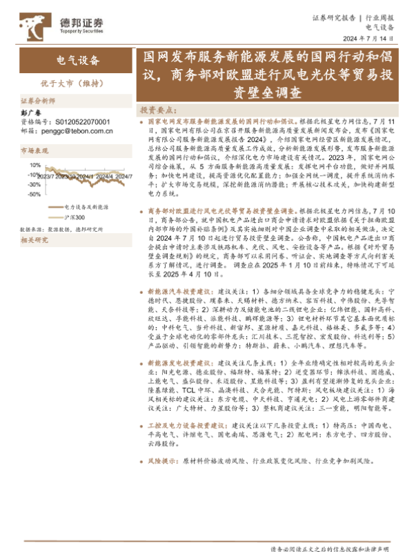【德邦证券】【20240714】电气设备行业周报:国网发布服务新能源发展的国网行动和倡议,商务部对欧盟进行风电光伏等贸易投资壁垒调查-13页 行业研究