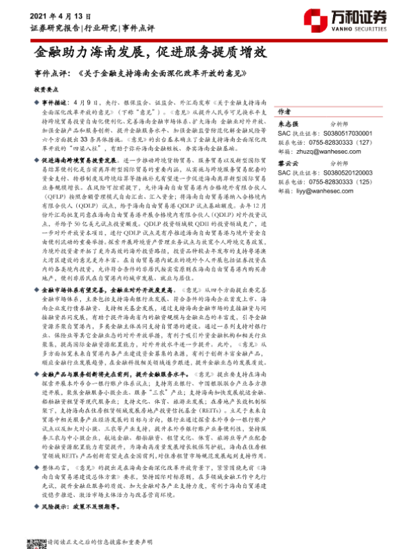【万和证券】【20210413】金融助力海南发展,促进服务提质增效-5页 行业研究
