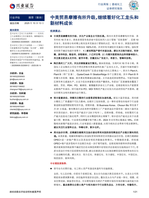 【兴业证券】【202510】基础化工行业周报:中美贸易摩擦有所升级,继续看好化工龙头和新材料成长-21页 证券期货研究报告