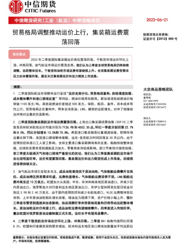 【中信期货】【20220621】工业(航运)中期策略报告:贸易格局调整推动运价上行,集装箱运费震荡回落-26页 行业研究