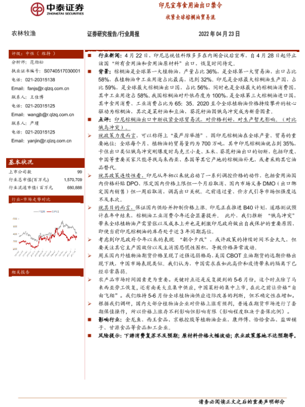 【中泰证券】【20220423】中泰证券-农林牧渔行业周报:印尼宣布食用油出口禁令 收紧全球棕榈油贸易流-6页 行业研究