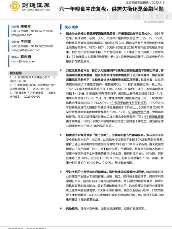 【财通证券】【20220701】六十年粮食冲击复盘:供需失衡还是金融问题-17页 行业研究