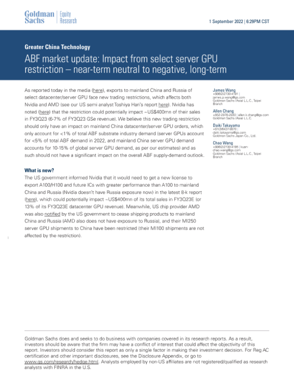 【Goldman Sachs】【20220901】m select server GPU restriction – near-term neutral to negative, long-term-9页 行业研究