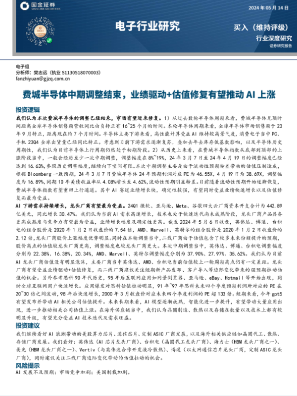 【国金证券】【20240514】电子行业研究:费城半导体中期调整结束,业绩驱动+估值修复有望推动AI上涨-18页 行业研究