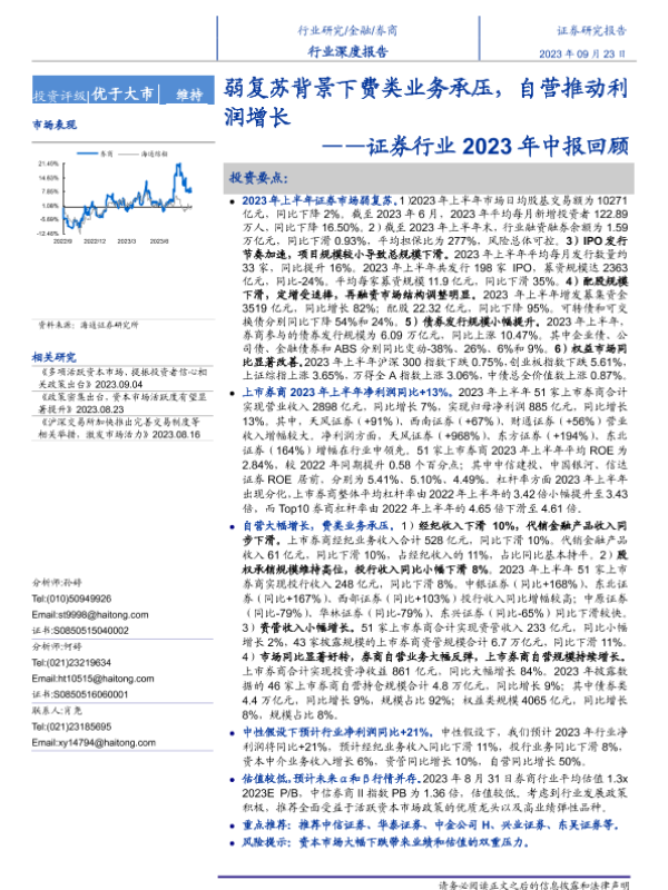 【海通证券】【20230923】证券行业2023年中报回顾:弱复苏背景下费类业务承压,自营推动利润增长-27页 行业研究