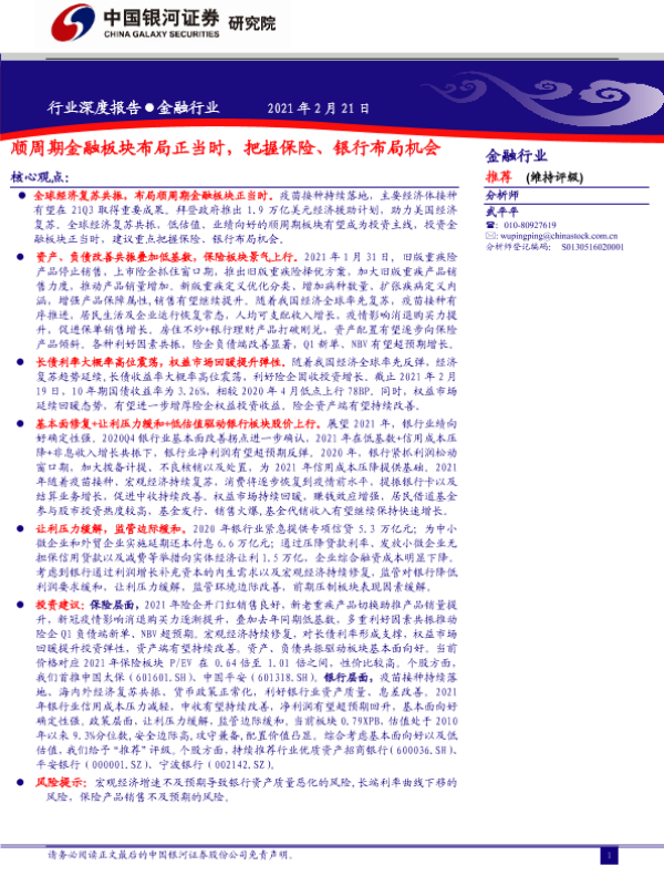 【银河证券】【20210221】金融行业:顺周期金融板块布局正当时,把握保险、银行布局机会-19页 行业研究