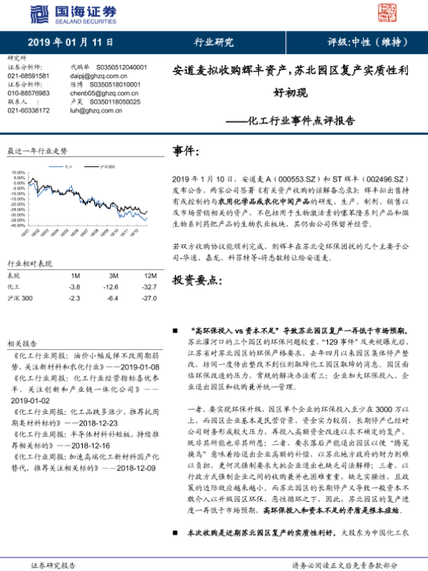 【国海证券】【20190111】化工行业事件点评报告:安道麦拟收购辉丰资产,苏北园区复产实质性利好初现-4页 行业研究