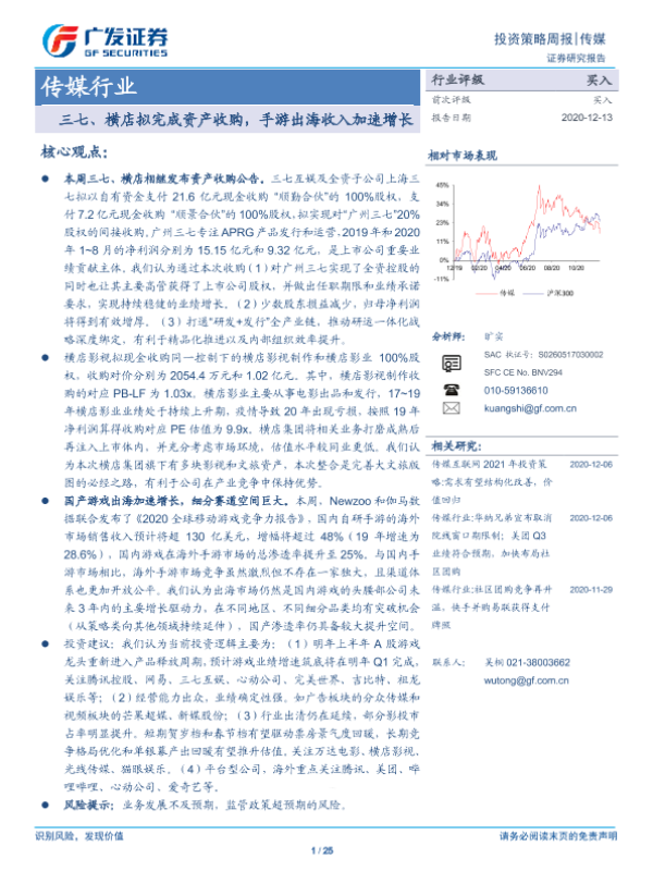 【广发证券】【20201213】20201213-广发证券-传媒行业投资策略周报:三七、横店拟完成资产收购,手游出海收入加速增长-25页 行业研究