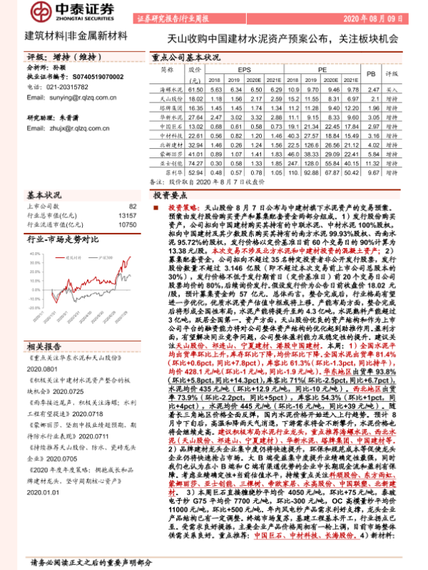 【中泰证券】【20200809】建筑材料行业周报:天山收购中国建材水泥资产预案公布,关注板块机会-23页 行业研究