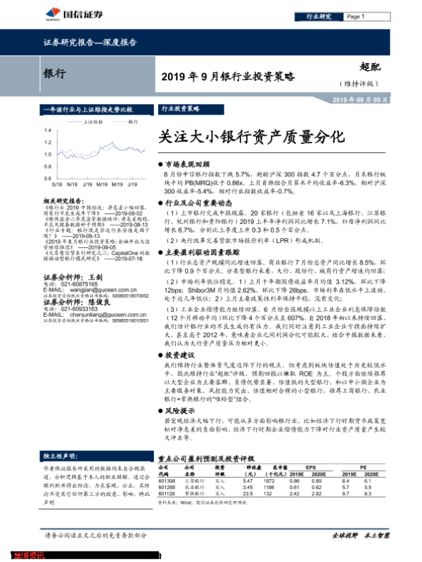 【国信证券】【20190905】2019年9月银行业投资策略:关注大小银行资产质量分化-9页 行业研究