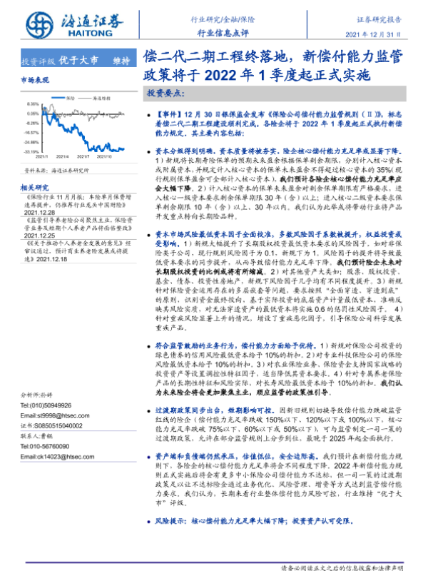 【海通证券】【20211231】偿二代二期工程终落地,新偿付能力监管政策将于2022年1季度起正式实施-4页 行业研究
