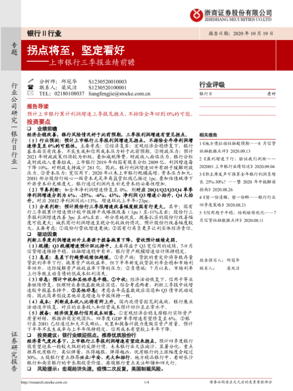 【浙商证券】【20201019】上市银行三季报业绩前瞻:拐点将至,坚定看好-4页 行业研究