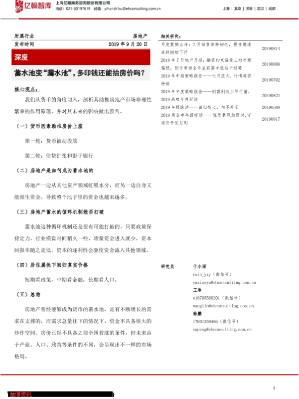 【上海亿翰商务咨询股份有限公司】【20190920】蓄水池变“漏水池”,多印钱还能抬房价吗?-8页 行业研究
