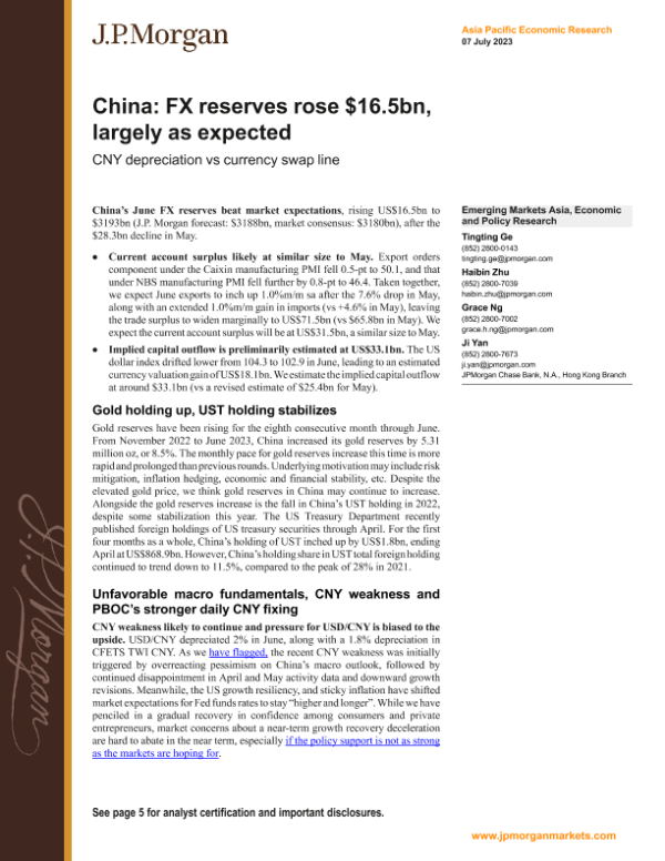 【J.P. Morgan】【20230707】China FX reserves rose $16.5bn, largely as expected-9页 行业研究