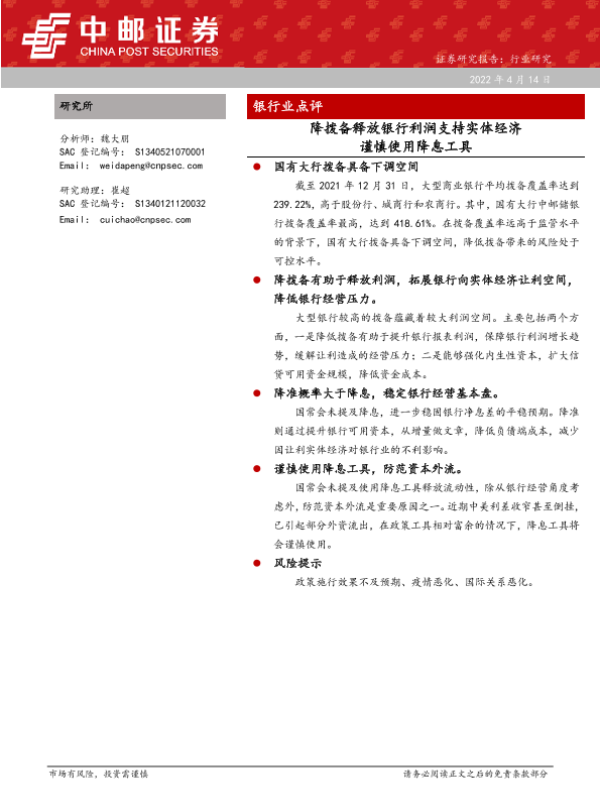 【中邮证券】【20220414】降拨备释放银行利润支持实体经济谨慎使用降息工具-8页 行业研究