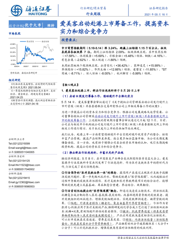 【海通证券】【20210516】商业贸易行业周报:爱美客启动赴港上市筹备工作,提高资本实力和综合竞争力-6页 行业研究