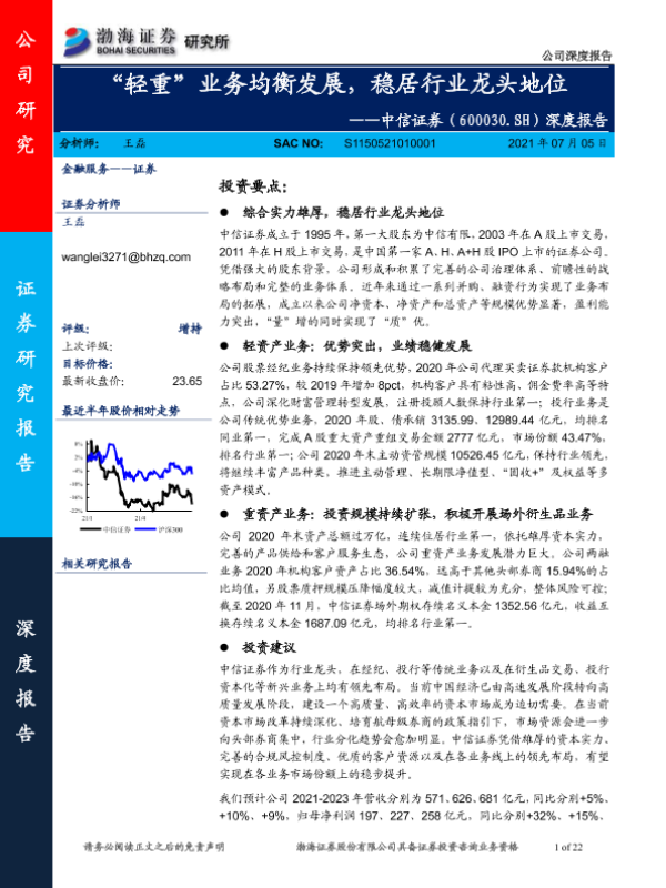 【渤海证券】【20210705】中信证券(600030.SH)深度报告:“轻重”业务均衡发展,稳居行业龙头地位-22页 行业研究