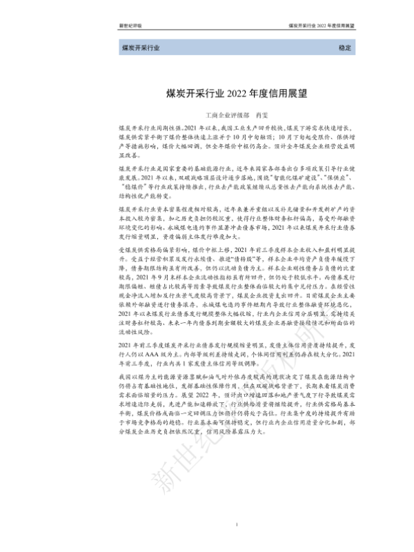 【新世纪评级】【20220101】煤炭开采行业2022年度信用展望-27页 行业研究