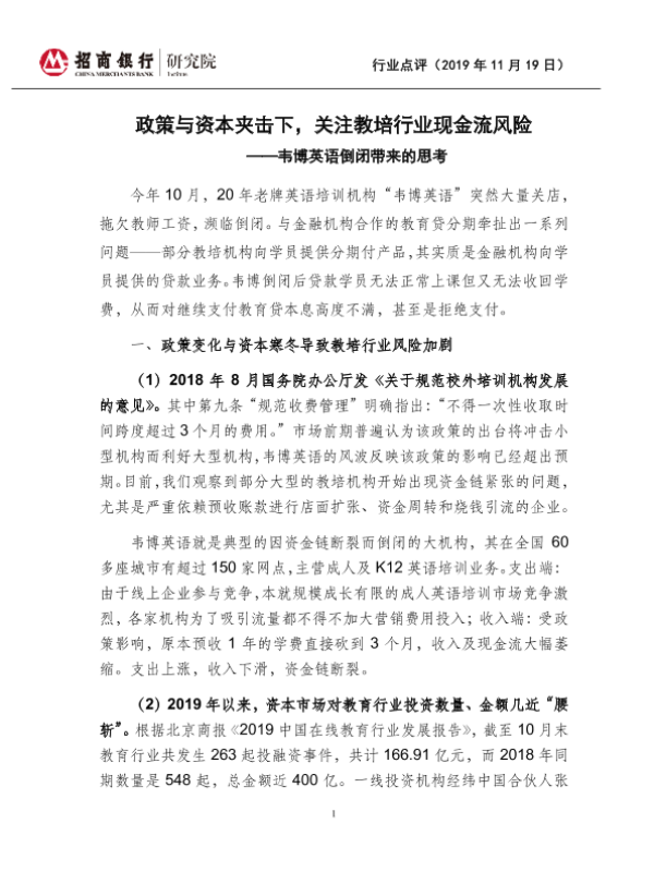【招商银行】【20191119】韦博英语倒闭带来的思考——政策与资本夹击下,关注教培行业现金流风险-4页 行业研究