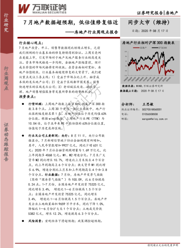 【万联证券】【20200817】7月地产数据超预期,低估值修复临近-7页 行业研究
