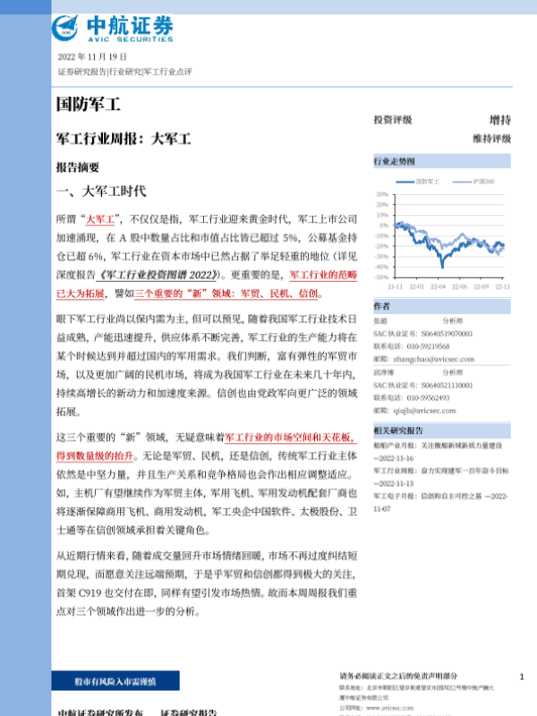【中航证券】【20221119】军工行业周报 大军工-63页 行业研究