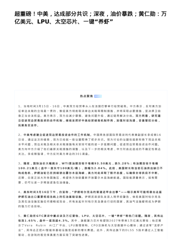 【光大证券】【202603】超重磅!中美,达成部分共识;深夜,油价暴跌;黄仁勋_万亿美元、LPU、太空芯片、一键“养虾”-7页 证券期货研究报告