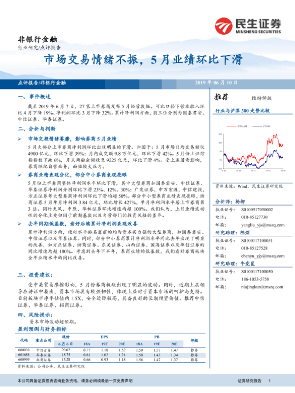 【民生证券】【20190610】非银行金融:市场交易情绪不振,5月业绩环比下滑-7页 行业研究