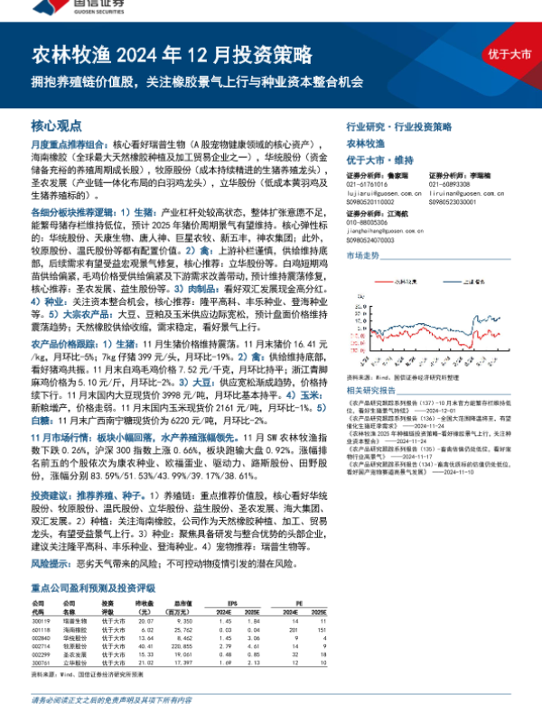 【国信证券】【20241208】农林牧渔行业2024年12月投资策略:拥抱养殖链价值股,关注橡胶景气上行与种业资本整合机会-20页 行业研究