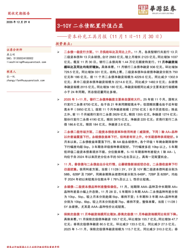 【华源证券】【202512】3-10Y二永债配置价值凸显——资本补充工具月报(11月 1日-11月 30日)-17页 证券期货研究报告