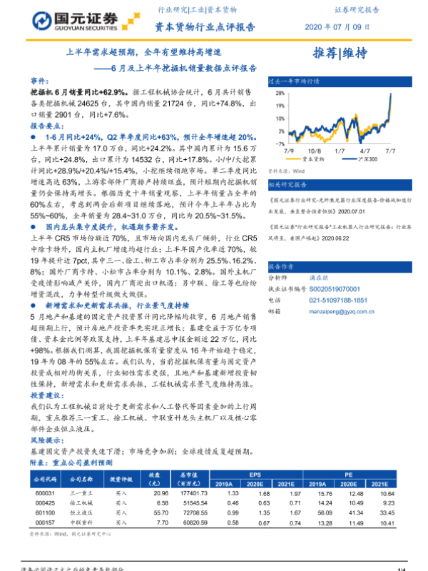 【国元证券】【20200709】20200709-国元证券-资本货物行业点评报告:6月及上半年挖掘机销量数据点评报告-半年需求超预期,全年有望维持高增速-4页 行业研究