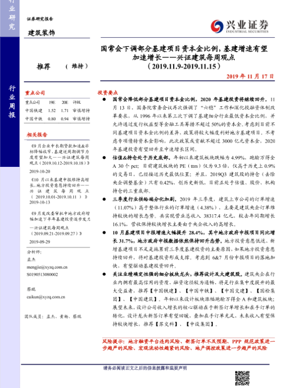 【粤开证券】【20191114】联讯建筑行业点评:基建资本金政策放松,首推低估值央企-4页 行业研究