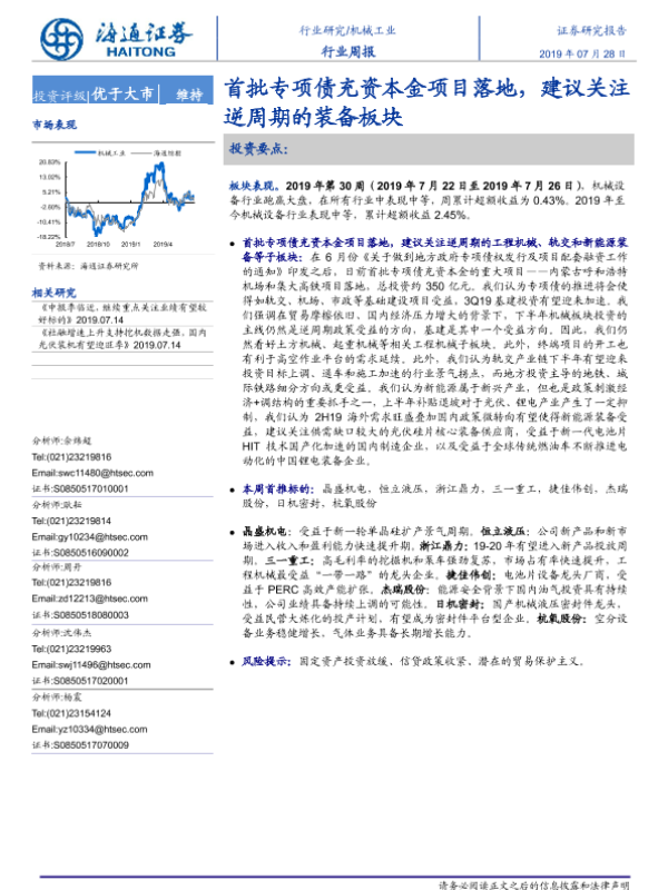 【海通证券】【20190728】20190728-海通证券-机械工业行业周报:首批专项债充资本金项目落地,建议关注逆周期的装备板块-10页 行业研究