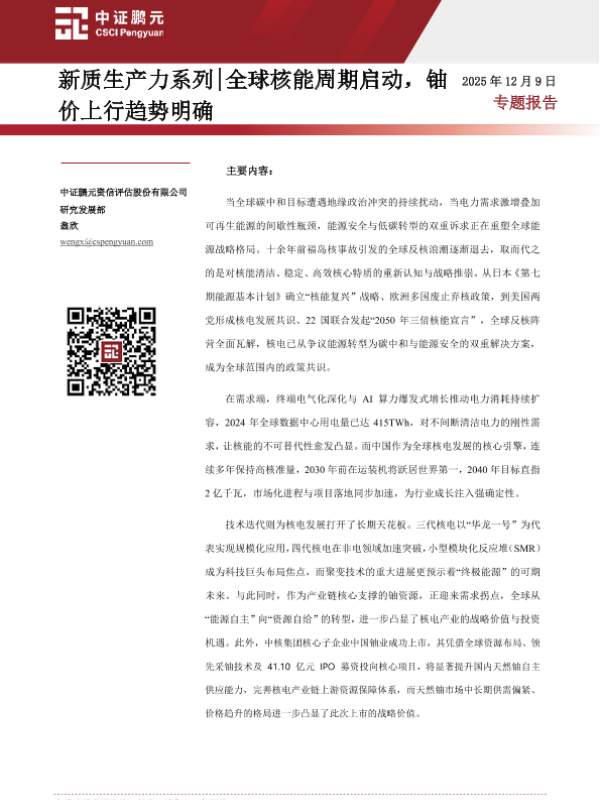 【中证鹏元资信评估股份有限公司】【202512】全球核能周期启动,铀价上行趋势明确-15页 证券期货研究报告