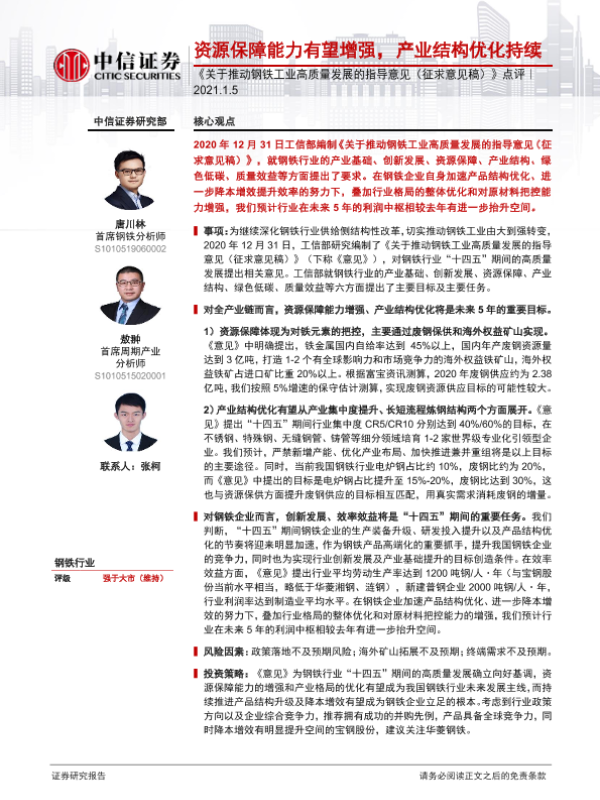 【中信证券】【20210105】《关于推动钢铁工业高质量发展的指导意见(征求意见稿)》点评:资源保障能力有望增强,产业结构优化持续-2页 行业研究
