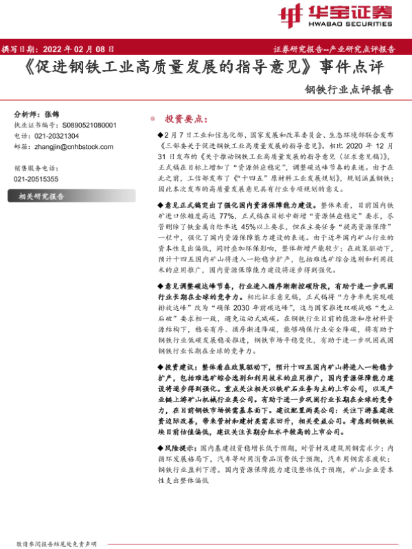 【华宝证券】【20220208】20220208-华宝证券-钢铁行业点评报告:《促进钢铁工业高质量发展的指导意见》事件点评-11页 行业研究