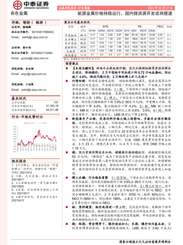 【中泰证券】【20220327】20220327-中泰证券-有色金属行业周报:能源金属价格持稳运行,国内锂资源开发或将提速-24页 行业研究