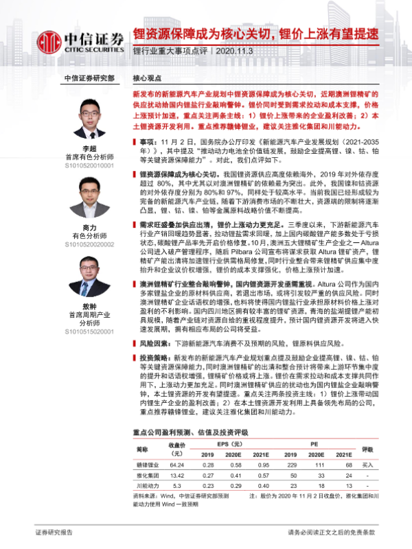 【中信证券】【20201103】锂行业重大事项点评:锂资源保障成为核心关切,锂价上涨有望提速-3页 行业研究