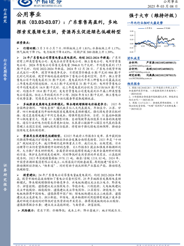 【华福证券】【20250308】20250308-华福证券-公用事业行业周报:广东零售高盈利,多地探索发展绿电直供,资源再生促进绿色低碳转型-19页 行业研究