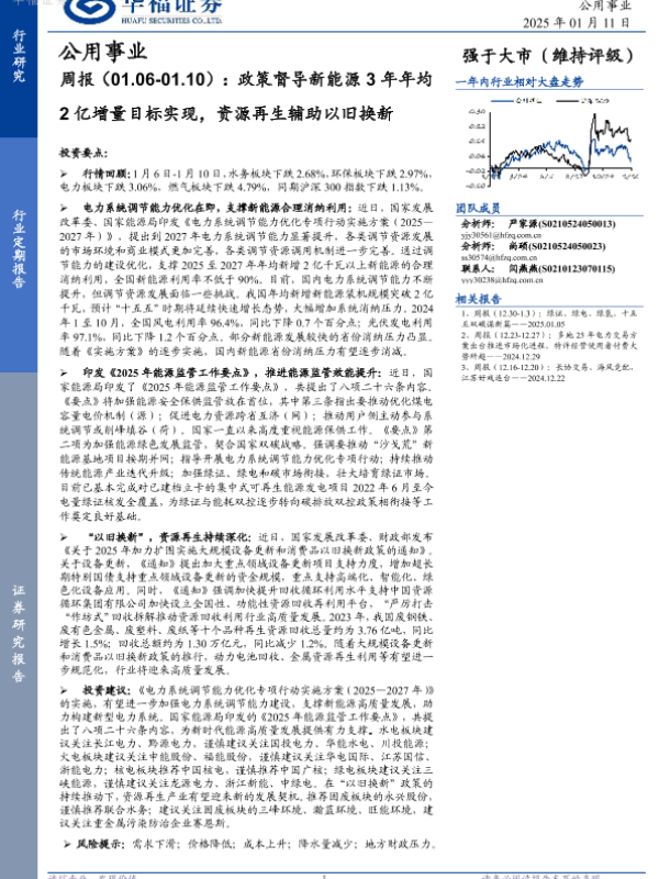 【华福证券】【20250111】公用事业周报:政策督导新能源3年年均2亿增量目标实现,资源再生辅助以旧换新-21页 行业研究