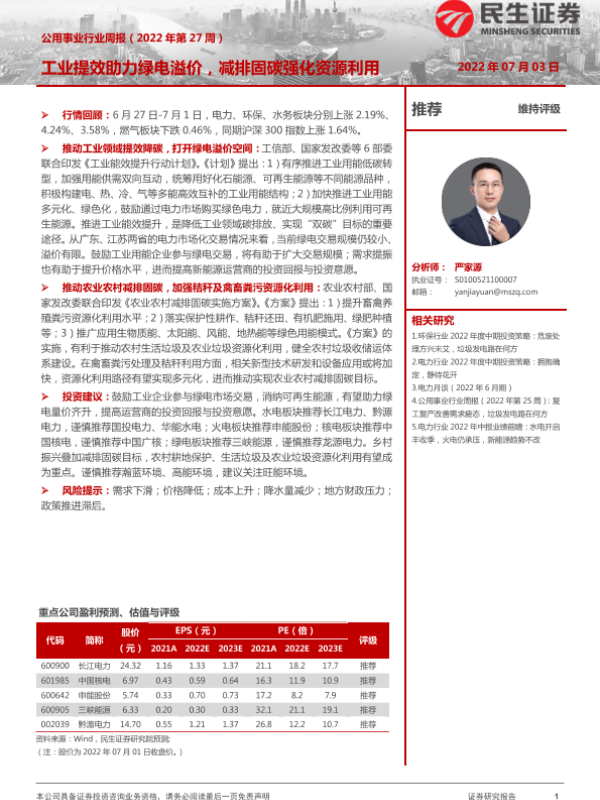 【民生证券】【20220703】公用事业行业周报:工业提效助力绿电溢价,减排固碳强化资源利用-26页 行业研究