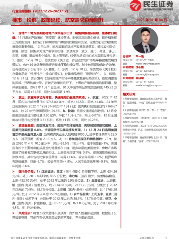 【民生证券】【20230104】策略专题研究:行业信息跟踪,楼市“松绑”政策延续,航空需求边际回升-29页 行业研究