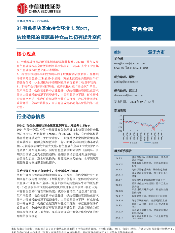 【中信建投证券】【20240512】有色金属行业:Q1有色板块基金持仓环增1.58pct,供给受限的资源品持仓占比仍有提升空间-17页 行业研究