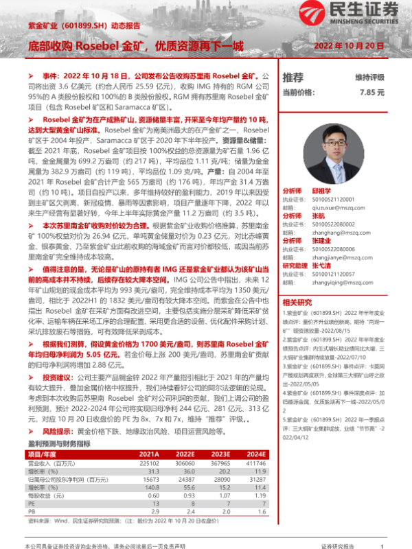 【民生证券】【20221020】动态报告:底部收购Rosebel金矿,优质资源再下一城-15页 行业研究