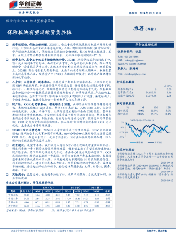 【华创证券】【20241002】2024年10月02日更新-【华创证券】保险行业24H1综述暨秋季策略:保险板块有望延续资负共振-21页 行业研究