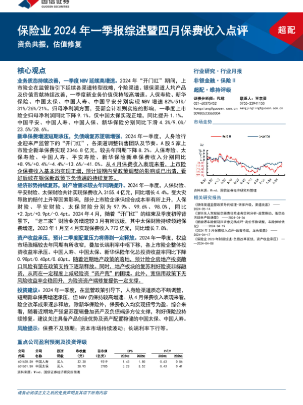 【国信证券】【20240518】保险业2024年一季报综述暨四月保费收入点评:资负共振,估值修复-14页 行业研究