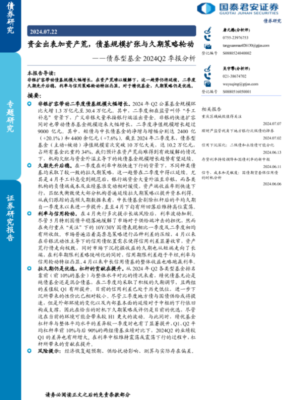 【国泰君安证券】【20240722】债券型基金2024Q2季报分析:资金出表加资产荒,债基规模扩张与久期策略轮动-14页 行业研究