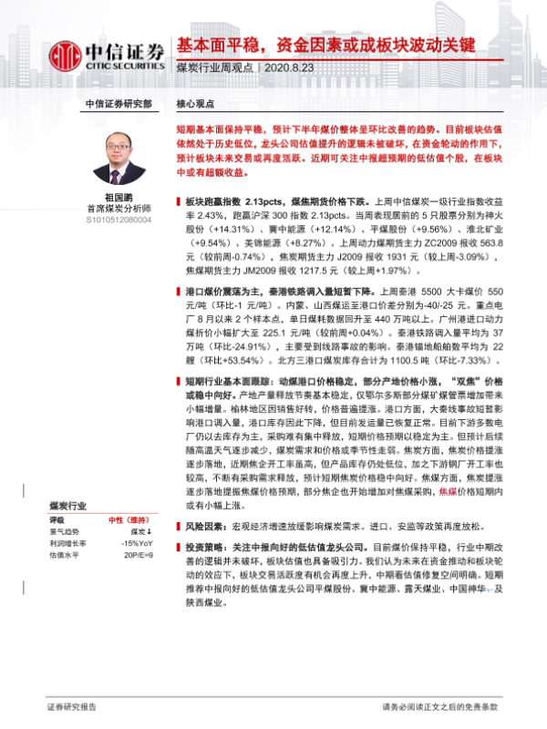 【中信证券】【20200823】煤炭行业周观点:基本面平稳,资金因素或成板块波动关键-8页 行业研究